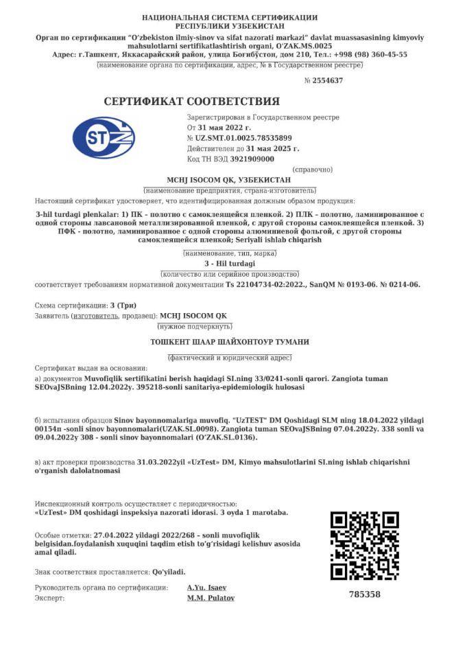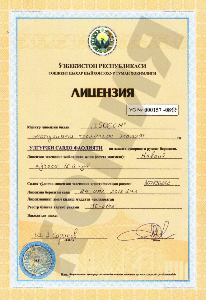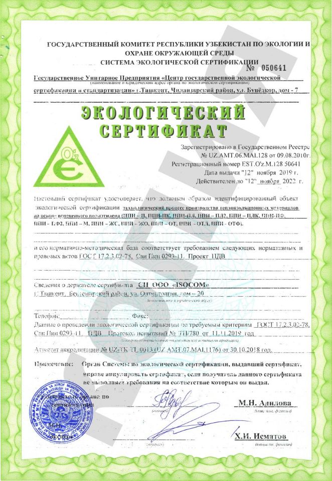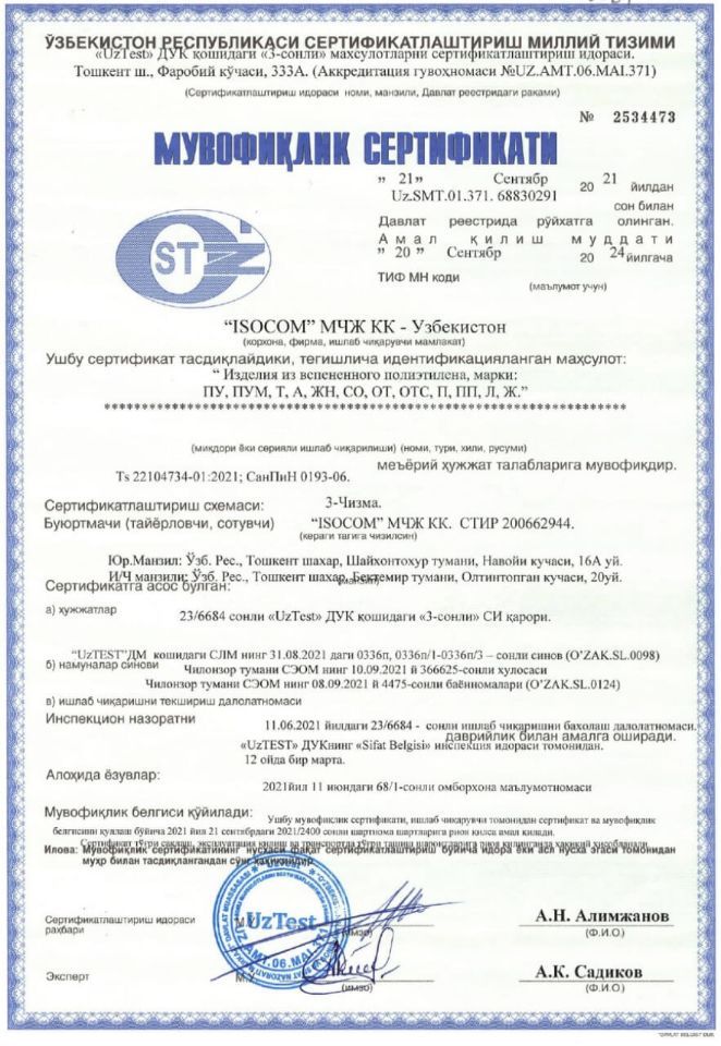 Узбекско-Российское совместное предприятие «ISOCOM» — динамично развивающаяся компания на рынке Узбекистана, специализирующаяся на производстве и реализации изоляционных материалов на основе вспененного полиэтилена. Продукция компании применяется для быстрого и эффективного утепления сооружений, трубопроводов и кондиционеров, а также используется в качестве упаковочного и прокладочного материала для бытовой техники и хрупких предметов. Кроме того, она востребована при изготовлении товаров народного потребления и для других нужд. Продукция ISOCOM отличается длительным сроком службы до 50 лет и низкой себестоимостью. В производстве изоляции ISOCOM не используется опасный газ фреон, разрушающий озоновый слой; вместо него применяется изобутан, используемый в парфюмерии. Мы сотрудничаем с известными российскими поставщиками сырья, что позволяет выпускать изоляционные материалы, соответствующие всем требованиям и нормам. Компания имеет все необходимые лицензии и сертификаты, а также предоставляет гарантию на свою продукцию. Продукция ISOCOM поставляется не только на внутренний рынок Узбекистана, но и экспортируется в Казахстан, Киргизстан и Туркменистан.